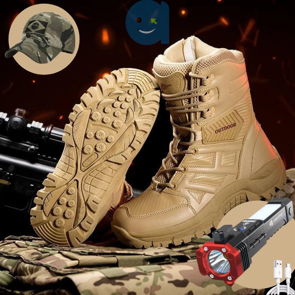 Aproveite a oportunidade de adquirir o Coturno Tático Ultra Resistente e ganhe um boné camuflado do Brasil e uma lanterna Guardião indestrutível 4 em 1. Esse kit é ideal para quem busca aventura e quer impor respeito.